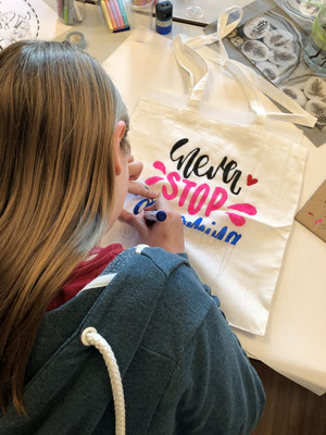 Am Mittwochnachmittag 11.3.2020 hatten Kinder ab der 4. Klasse die Möglichkeit an einem Handlettering Workshop teilzunehmen. 9 Mädels nutzten diese Chance und verbrachten einen kreativen Nachmittag im Pfarreiheim in Zuzwil. Unser Handlettering-Profi Tanja Giger lehrte uns ein einfaches Handlettering-Alphabet und zeigte uns die vereinfachte Form der Faux-Calligraphy, sowie viele weitere Tipps & Tricks. Zum Beispiel wie man mit einem einfachen Kränzchen ein schönes Kärtchen gestaltet. Gestärkt mit feinen Muffins, Äpfeln und Sirup ging es nach einer kurzen Pause weiter. Unter fachkundiger Anleitung und inspiriert von vielen Farben und Stiften durften wir eine tolle Tasche gestalten und unserer Kreativität freien Lauf lassen. Viel zu schnell ging der Nachmittag vorbei. Mit vielen tollen Eindrücken, einer perfekt vorbereiteten Mappe mit Unterlagen und Übungsmaterial, einigen Stiften und unserer Tasche machten wir uns auf den Weg nach Hause. Für diesen spannenden Workshop möchte sich der Kidolino-Vorstand ganz herzlich bei Tanja Giger bedanken.