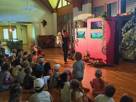 Endlich konnten wir unser geliebtes Kasperlitheater wie gewohnt ohne Masken und anderen Einschränkungen durchführen. Die knapp 60 Kinder mit den jeweiligen Mamis, Papis, Grosis, etc. waren von Bettina Leibundgut, welche die zwei Aufführungen «Der Bäribrumm im Indianerland» und «s’Gschpängschtli Hii-Pii und die chlini Sophie» spielte, total begeistert.